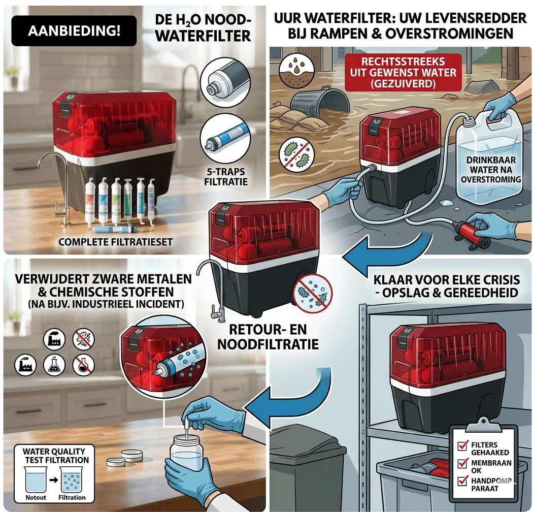 Een mens overleeft weken zonder eten, maar slechts 3 dagen zonder drinkwater. Bij een drinkwater ramp — overstromingen, kraanwater uitval of infrastructuuruitval — vervuilen bronnen razendsnel met bacteriën en chemicaliën. De Nederlandse overheid, het Rode Kruis en de WHO raden aan om je voor te bereiden met een betrouwbare survival waterfilter.